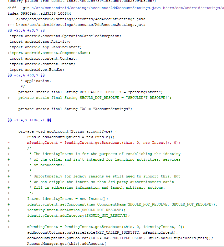 本次的漏洞就发生在流程图的Step1之前, Setting调用了AccountManager.addAccount。在传递的AddAccountOptions参数时加入了一个PendingIntent,其intent类型是Broadcast。注意这个PendingIntent是Settings创建的,拥有system权限。