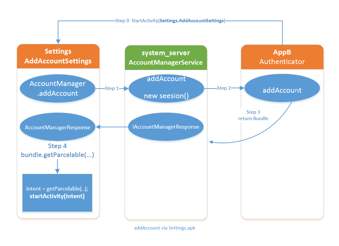通过补丁[2]可以看到漏洞发生在src/com/android/settings/accounts/AddAccountSettings.java 的 addAccount 函数中。这回这个漏洞出现在Settings添加账户的时候。使用AccountManager添加账户的流程如下图: